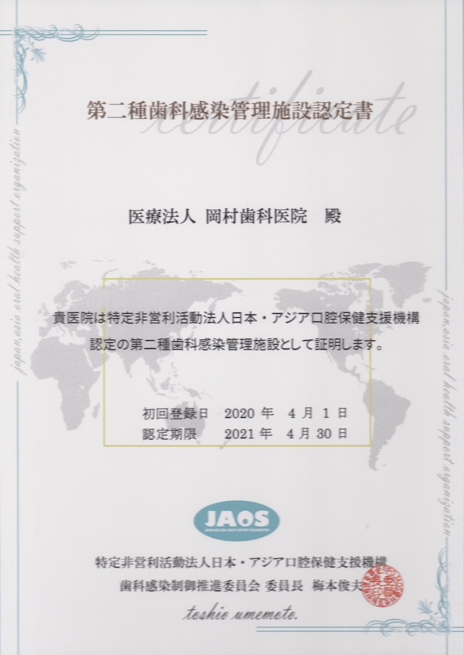 先日お伝えしていた第二種歯科感染管理施設に認定され、認定書が届きました。