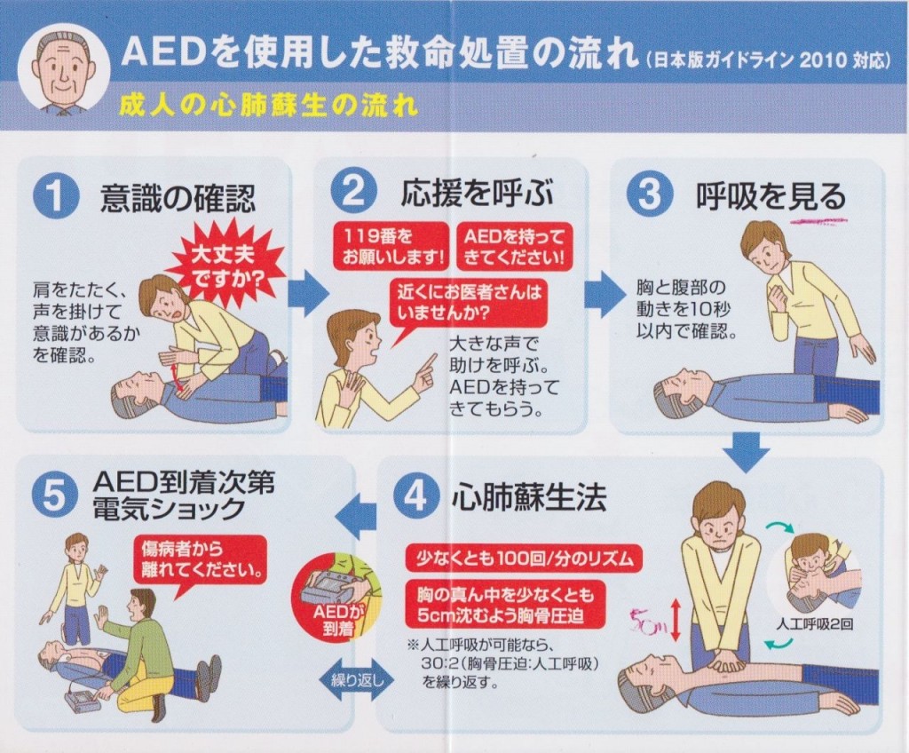 先日AEDの新しいパッドが届いたので、今日はスタッフ皆で古いパッドを使って使い方の確認と救急蘇生の復習をしました。