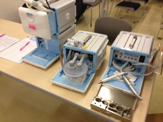 会場の隅には歯科医師会に新しく導入された在宅歯科診療用のポータブル診療器材が展示されていました。これらは歯科医師会会員は希望すれば貸し出していただけます。最新のものでコンパクトによくまとまっているなと思いました。ただコンパクトに折りたたまれている分準備には多少煩わしさがあるようでした。